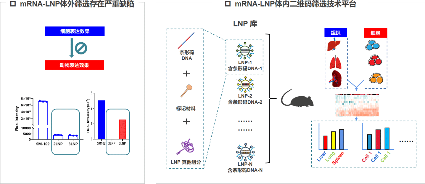 目前现有的细胞评价筛选平台不能准确表征新型LNP体内表达效果,为了解决这个问题,我们创新地使用mRNA-LNP体内二维码筛选技术,即通过注射混合有不同设计的LNP,利用每个LNP包载的特异性DNA片段(DNA条形码),高通量地评价上述LNP的组织和细胞层面的靶向性能,从而达到高效筛选的目的。